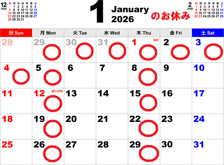 年末年始のお知らせと1月のカレンダー