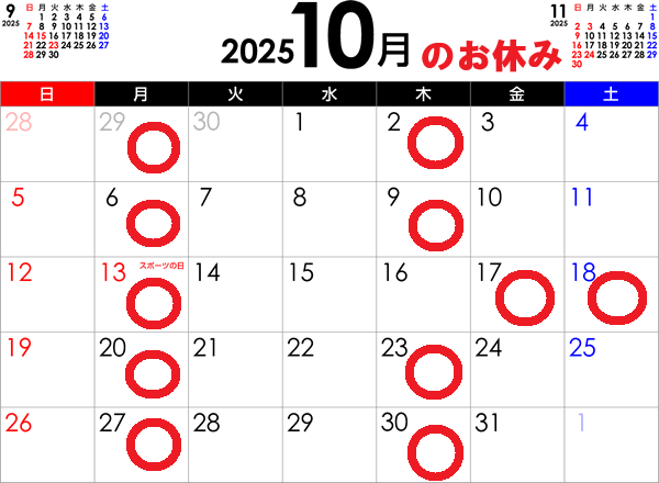明日10月13日月曜日は定休日とります、大変ご迷惑をお掛け致しますが、宜しくお願い致します。