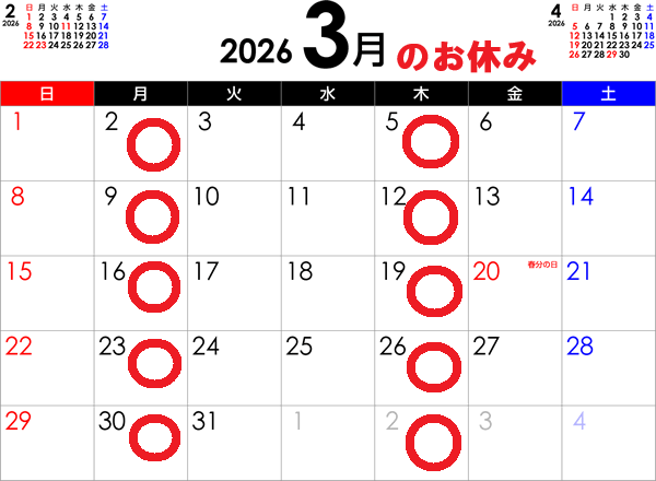 明日3月2月曜日は定休日とります、大変ご迷惑をお掛け致しますが、宜しくお願い致します。